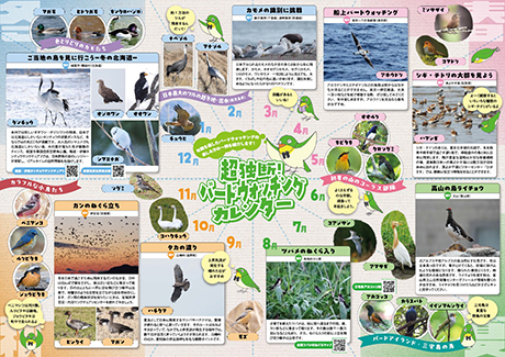 広げるとポスターのように一目で一年間の野鳥の見どころがわかる「バードウォッチングカレンダー」のほか、バードウォッチングを楽しむための情報も掲載しています。