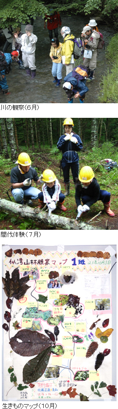 2009年度の「森と自然とふれあおう!」は北海道むかわ町と厚真町にまたがる似湾(にわん)山林で6、7、10月の3回開催され、合計108名の方に参加いただきました。各回1泊2日の行程で、「森の生物多様性にふれる」をメインテーマに、班毎に分かれて森林での自然観察と観察マップ作りを行いました。 この他6月は森と干潟のつながりを知るための「干潟観察」、7月は森の管理を知る「間伐体験」、そして10月は「フクロウの巣箱作りと巣箱かけ」と各回ごとにサブテーマを設け、希望者向けの早朝バードウォッチングもあり、という盛り沢山のプログラムでした。
