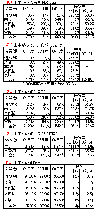 ■06年度上半期の会員数報告■ 今年度上半期の新入会者数は前年同期の1,161人より163人減少しました。上半期の入会者数のうち、前年同期に比べ増加となった会員種類は個人特別会員のみで+4人でした(表1)。オンライン入会の利用者は前年同期に比べ27人の増加となりました。オンライン入会は、当会ホームページからその場で申込ができるというシステムです。今年度はインターネット上での広告を行ったため、昨年度に比べ利用率が高くなったと考えられますが、オンライン入会の伸びだけでは新入会者減少を食い止めるには至っておりません(表2)。新入会者の経路を分析してみると、一般層からの資料請求が減少していること、またイベントなどでのパンフ配布数が減少していることが主な要因として考えられます。 一般層からの資料請求については当会がマスコミなどで取り上げられる頻度との関連性が想定され、露出機会を増やしていくこと、またイベントでのパンフ配布についてもできるだけ増やしていくことが対策として重要かと考えております。 今年度上半期の退会者数は前年同期の1,142人より401人増加しました(表3)。 退会者には、退会する旨を連絡してくる「申し出退会者」と会員猶予期間を過ぎても会費の支払いがなく非会員となる「会費切れ退会者」の2種類ありますが、前年同期に比べどちらも増加しています。このうち申し出退会者の増加は、昨年度から会費切れの方への継続のお願いの回数を増やし、最後には直接電話して継続依頼をしていることにより、従来だと会費切れ退会となっていた人が電話の際に口頭で退会を申し出るようになったためと思われます。また会費切れ退会者でも、昨年度から会費切れ猶予期間を延長し一律7ヶ月間としたことにより、2005年度上期には新たな会費切れ退会者が発生しなかったため、それに比べて今年度は増加した結果となっています(表4)。 2004年度との比較では退会者数は減少していますので、会費切れ猶予期間を延長し、その間に継続のお願いを繰り返した効果が現れているのではと考えています。 今年度上半期の継続率は96.5%で、前年同期の97.9%より1.4ポイント低くなりました。先にご説明したように2005年度には会費切れ猶予期間の延長を行ったため一時的に退会者数が減り、継続率が高くなっています。このため、前年同期と比較すると継続率は全体的に落ちていますが、2004年度と比較すると継続率は0.6ポイント上昇しています(表5)。これは、先に述べました会費切れの方に対する取り組みを始めたことによるものと思われます。 なお、2005年度末の継続率は94.1%と同年度上半期の継続率97.9%よりも低いものとなっていますが、これは上半期に比べ下半期に更新時期を向かえる会員が多いためです。2006年度末の継続率も上半期の継続率96.5%より低くなると考えられます。 |