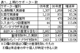 | ■06年度上半期のサポーター数について■ 会員ではなくても、商品の購入や寄付などをいただける方は大切な会の支援者です。昨年度より、この方々の数を「サポーター数」として集計するようにしており、05年度は5,825人でした。野鳥誌巻末の会員数表記では、この数をプラスして記載しております。 このサポーター数は、期間中の商品購入者、寄付者、募金箱・パンフレット等の設置協力者、バードプラザへの来店者の中で、それぞれ個人が識別できる方かつ会員ではない方の実数を合算し、商品購入と寄付など重複してご支援いただいている方の分を引いて算出しています。この集計対象となっている方以外にも、たとえば募金箱に募金をしてくださる方なども会へご支援をくださっていることになりますが、実数が把握できないものは集計からは省かせていただいています。 物品購入や寄付はひとりの方が期間中に何度もされる場合がありますし、またサポーターが期中から会員になられる場合もありますので、集計は非常に複雑になります。そのため集計期間を区切り原則として年度単位とし、公式の数字は年度末のものを1年間使用することとしていますが、ここでは上半期の状況について仮に集計したものをご報告いたします。 06年度上半期にご支援をいただいた非会員サポーター数は3,401人でした。 昨年度はバードプラザへの非会員来店者数を集計に含めていなかったので、これを除いた数値で比較すると、昨年度2,601人、今年度3,135人となり、前年同期比で+534人となりました。 内訳などの詳細は以下の表をご覧ください。