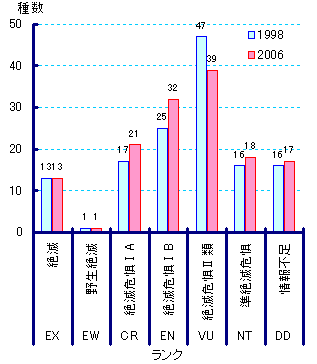 「日本における絶滅のおそれのある野生生物種のリスト」(通称レッドリスト)は、平成3(1991)年に環境省によるレッドデータブックの発行の後、平成10(1998)年に改訂リストが公表されていました。今回は、平成14年から進められていた改訂作業によるものです。 改訂の検討は、環境省が絶滅のおそれのある野生生物種の選定・評価検討会の下に分類群毎に分科会を置いて行われました。鳥類については、藤巻裕蔵・帯広畜産大学名誉教授を座長に、合計5名の委員により検討が行われました。当会からは、金井裕・自然保護室主任研究員が委員となっています。 レッドリストは、平成10(1998)年公表リストよりIUCNのレッドリスト基準を基本に選定が行われるようになりました。検討は亜種単位で行われ、迷行種を除く700種が対象となりました。検討のためには可能な限り科学的データを収集する必要があります。生息データの収集は、全国の研究者や野鳥観察を行っている方々の協力を得て進められました。当会が現地調査を実施した全国繁殖分布調査結果や、各地の当会支部による地域での調査データが改訂検討にあたって重要な役割を果たした種も多くあります。 2.掲載種数 レッドリストには、絶滅、野生絶滅、絶滅のおそれのある種、準絶滅危惧、情報不足、絶滅のおそれのある地域個体群が掲載されています。準絶滅危惧は、なんらかの要因で生息状況が悪化すると絶滅のおそれのある種に容易に移行する種、情報不足は生息情報が少ないため判定ができないが、生息数が多いとは思えない種で、どちらも生息状況等の監視など注意を要するものです。 絶滅のおそれのある種の総数は92種となり、鳥類の評価対象種の約700種のうち、13%の種に絶滅のおそれがあるという結果となりました。すでに絶滅してしまった種や、レッドリスト掲載直前の準絶滅危惧種なども含めると、生息保全上問題があるとされる種の合計は、20%を越えました。 絶滅のおそれのある種は、絶滅危惧TA類の21種、絶滅危惧TB類の32種、絶滅危惧U類の39種という内訳になります。絶滅危惧U類は前回の47種から8種減りましたが、絶滅危惧TA類は17種から4種の増加、絶滅危惧TB類は25種から7種の増加と、絶滅の危険性の高いランクが増加しており、全体的に悪化していることが示されます。