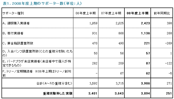 08年度上半期にご支援をいただいた非会員サポーター数は3,894人となり、前年同期比で+251人となりました。内訳などの詳細は以下の表をご覧ください。