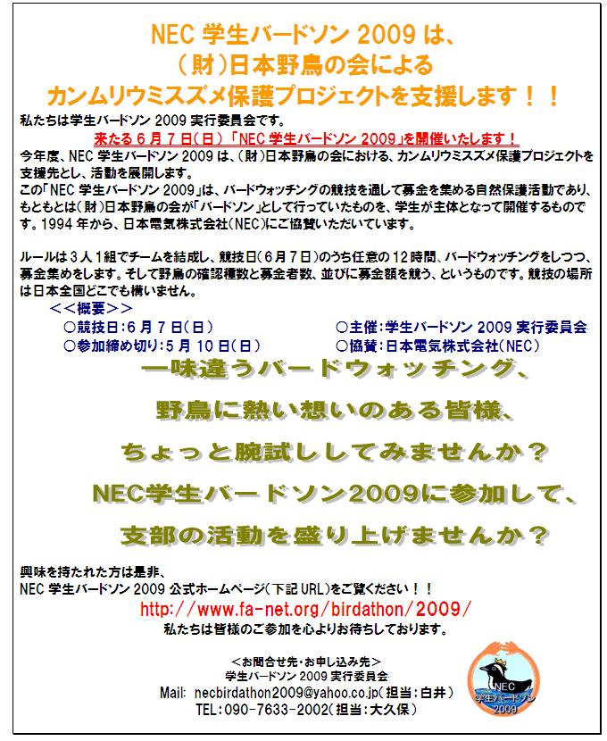 NEC学生バードソン2009が、当会のカンムリウミスズメ保護プロジェクトを応援してくださることになりました。
