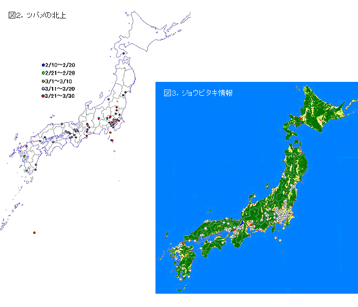 見つけて渡り鳥では、多くの方が参加いただけるようにウグイス、ツバメ、コアジサシ、カッコウ、ホトトギスの夏鳥とジョウビタキ、ユリカモメ、ハクチョウ類を対象としています。サイトをリリースしたのが、2月ということからウグイス、ツバメ、ジョウビタキを中心に544件の情報を多く寄せていただいております。いただいた情報から、ツバメが九州西部に2月下旬に姿を見せ、3月上旬には四国や関東南部に、3月中旬には津軽海峡を渡って北海道に姿を見せていたことが分かりました。(図2)また、ジョウビタキについていただいた情報を土地利用図(地球地図)に重ねて表示してみると、情報が都市部に比較的多く、また北海道では見られないとなっています。(図3)