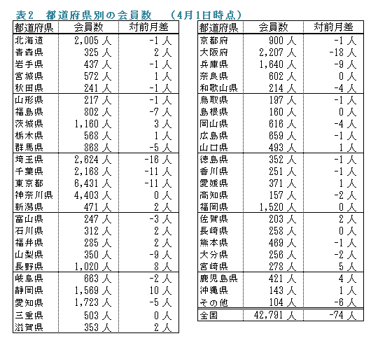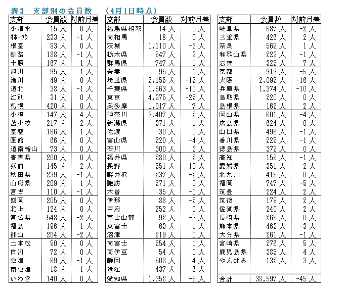 備考:支部別の会員数の合計は、都道府県別の会員数の合計と異なります。これは、本部型(青い鳥)会員や支部に所属されていない個人特別会員が支部別の会員数に含まれないためです。