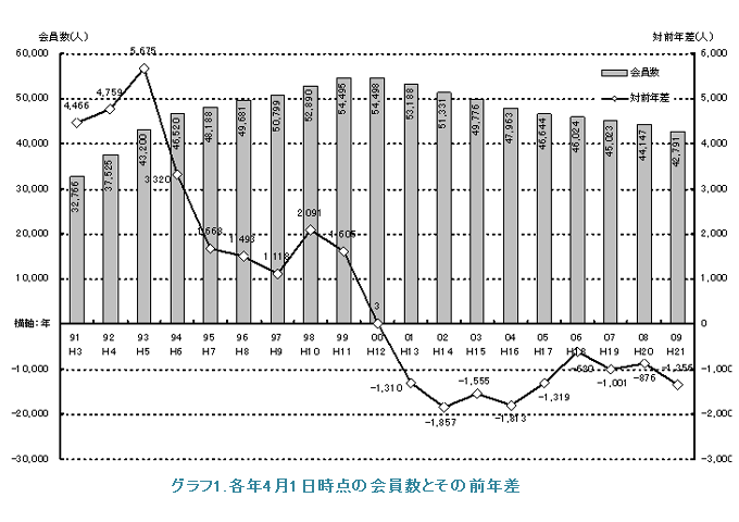 2008年度の新入会者数は1,845人、退会者数は3,397人でした。2009年4月1日時点の会員数は42,791人となりました。