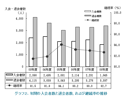 グラフ1は1991年以降の期首会員数と、前年差を示したものです。依然会員の減少が続いておりまして、07年度には縮まった前年差もまた開きが大きくなってしまいました。この原因は入会者数の減少です(表2)。年間の入会者数が2千人を割るのは近年にはなく、会員拡大では寄り厳しい状況になってきたと思われます。