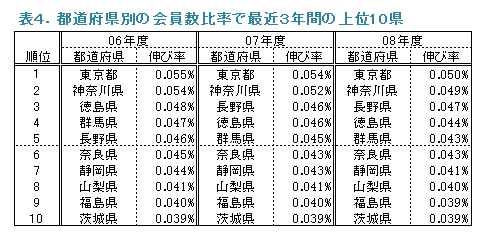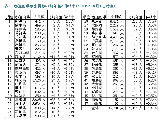 都道府県別の会員数の増減傾向を対前年の伸び率の高い県から順に表1に示しました。08年度の伸び率が最も高いものは新潟県の1.06%、続いて熊本県の0.43%でした。全体では−3.17%となりました。