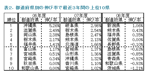 07年度は第1位が岐阜県の2.98%、第2位が栃木県でしたが、08年度ではどちらも10位以内には入っていません。最近3年間でも、3年連続で10位以内の都道府県はありませんでした。また上位の伸び率も年々小さくなってきています(表2)