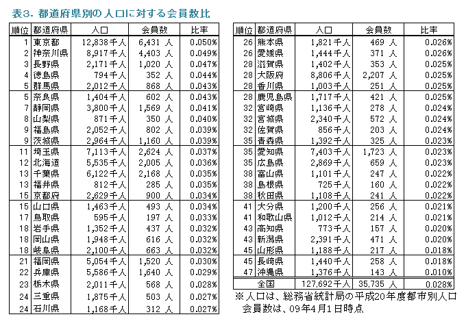 次に都道府県の人口に対してその会員数がどれくらいの割合かを表3に示しました。用いた人口は、総務省統計局が出している2007年10月1日現在の人口推計値です。全国平均は、0.033%と昨年の0.034%よりも0.001ポイント減少しました。