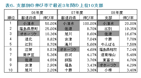 最近3年間では、小清水支部、オホーツク支部、佐渡支部が3年連続で10位以内になりました(表6)。小規模な支部の方が伸び率で効果が出やすいという面もあるかと思います。