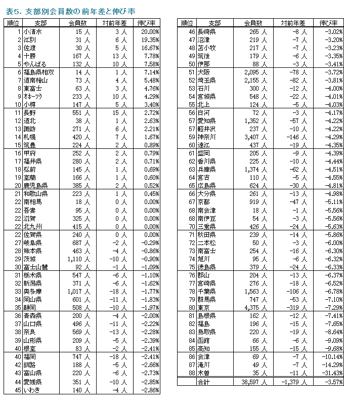 支部の会員数の増減傾向を対前年の伸び率の高い順に表5に示しました。会員数が増加した支部は、07年度の24支部より3支部減少し21支部となりました。上位10支部のうち6支部を、北海道ブロック内の支部が占めました。支部会員の全体の伸び率は−3.57%で、07年度の−2.61%、06年度の−2.88%より悪化しました。