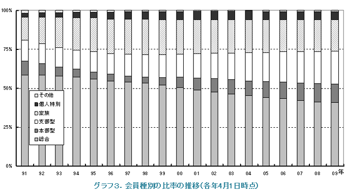 グラフ3は会員種別の比率の推移を示しています。依然として総合会員(おおぞら会員)の比率は年々下がり、支部型(赤い鳥会員)と本部型(青い鳥)の比率が高くなってきています。1年前と比較すると総合会員は41.4%から40.8%と減少し、支部型は20.8%から21.3%、本部型は11.6%から11.9%と増加しています。