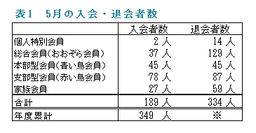 5月の入会・退会者数の表をみますと、入会者数は退会者数より145人少なくなっています。会員の増減は、入会者数と退会者数のほかに、会費切れ退会となった後に会費が支払われ会員として復活した人数によって決まります。