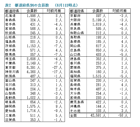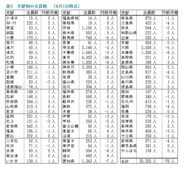 備考:支部別の会員数の合計は、都道府県別の会員数の合計と異なります。これは、本部型(青い鳥)会員や支部に所属されていない個人特別会員が支部別の会員数に含まれないためです。