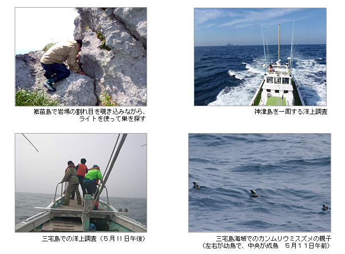 繁殖期の調査は、伊豆諸島・三宅島で当会レンジャーが常駐しているアカコッコ館を中心に行っています。調査内容は洋上での個体数調査と繁殖地での営巣調査で、調査範囲は伊豆諸島の三宅島周辺海域と神津島周辺海域です。調査員はアカコッコ館のレンジャーをはじめ、通常業務では鳥の調査などに関わらない事務所の職員も研修的な意味で多く参加しているも特色です。