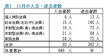 11月の入会・退会者数の表をみますと、入会者数は退会者数より282人少なくなっています。会員の増減は、入会者数と退会者数のほかに、会費切れ退会となった後に会費が支払われ会員として復活した人数によって決まります。11月の入会者数は80人で、前年同月の入会者数107人に比べ27人減少しました。