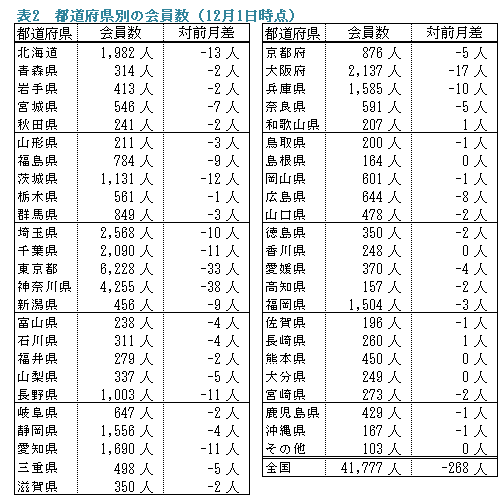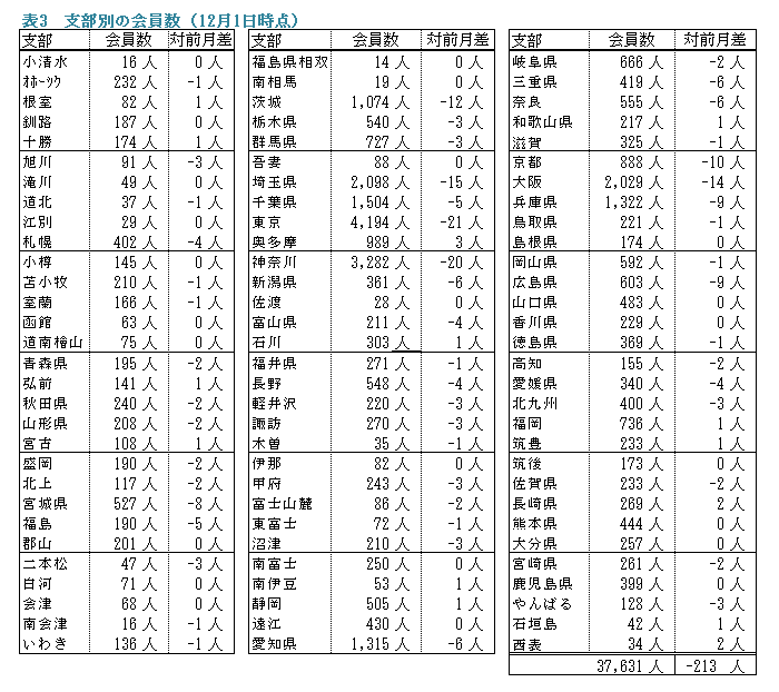 備考:支部別の会員数の合計は、都道府県別の会員数の合計と異なります。これは、本部型(青い鳥)会員や支部に所属されていない個人特別会員が支部別の会員数に含まれないためです。