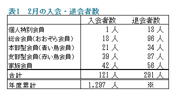 また、2月の退会者数は291人で、前年同月の退会者数316人に比べ25人減少となりました。