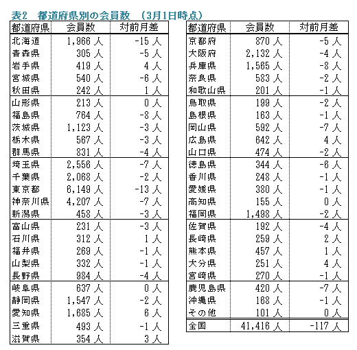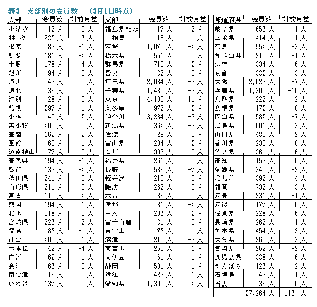 備考:支部別の会員数の合計は、都道府県別の会員数の合計と異なります。これは、本部型(青い鳥)会員や支部に所属されていない個人特別会員が支部別の会員数に含まれないためです。