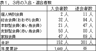 また、3月の退会者数は301人で、前年同月の退会者数301人と同数となりました。