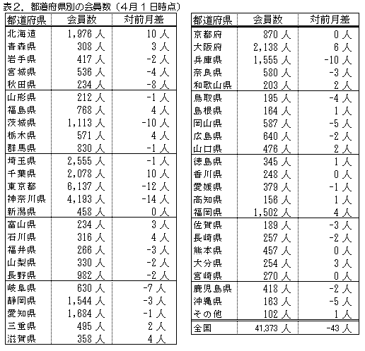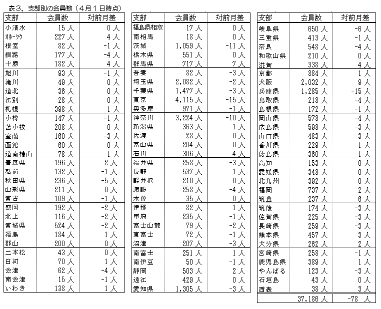 備考:支部別の会員数の合計は、都道府県別の会員数の合計と異なります。これは、本部型(青い鳥)会員や支部に所属されていない個人特別会員が支部別の会員数に含まれないためです。