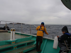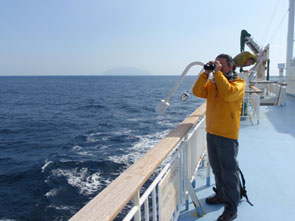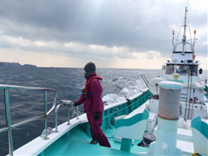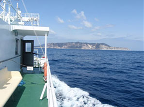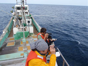 ![]() サルビア丸デッキでの観察。中央遠くは御蔵島 |