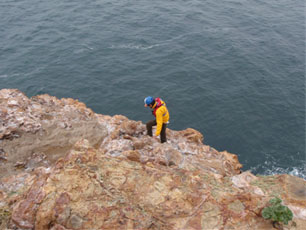 高知県の幸島での繁殖情報を基に調査を行ない、カンムリウミスズメとオオミズナギドリの両方を確認できた。幸島は小さい島で、海岸からすぐに崖があり、スゲ類が生えている。スゲ類の下にカンムリウミスズメの営巣を確認した。巣を持たない個体も確認した。崖を登り、アマツバメが巣を作る岩の隙間にも営巣していた。今後は、未調査の島を調べていきたい。