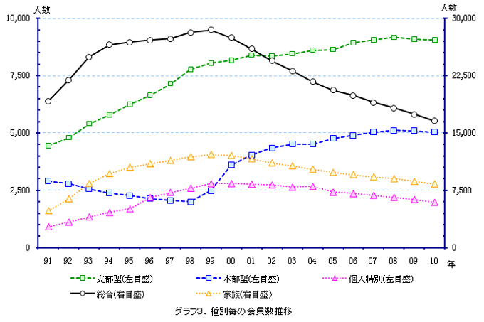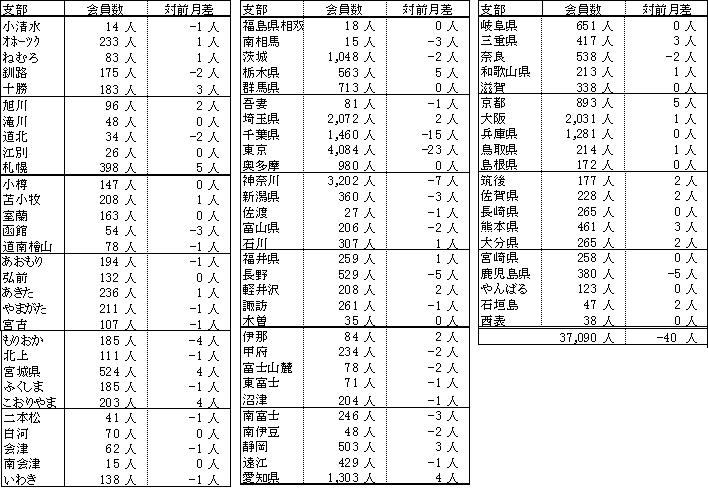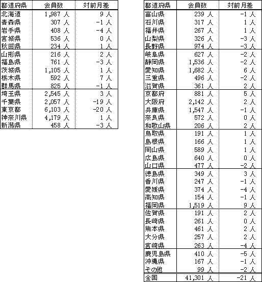 備考:支部別の会員数の合計は、都道府県別の会員数の合計と異なります。これは、本部型(青い鳥)会員や支部に所属されていない個人特別会員が支部別の会員数に含まれないためです。