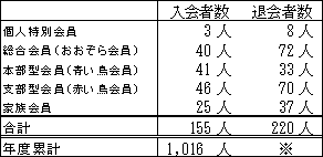 ※会費切れ退会となった後に会費が支払われ会員として復活する方がいらっしゃるため、退会者数の年度累計は、実際の退会者数とずれた数字となります。このため、退会者数合計については年度末の集計後にお知らせいたします。