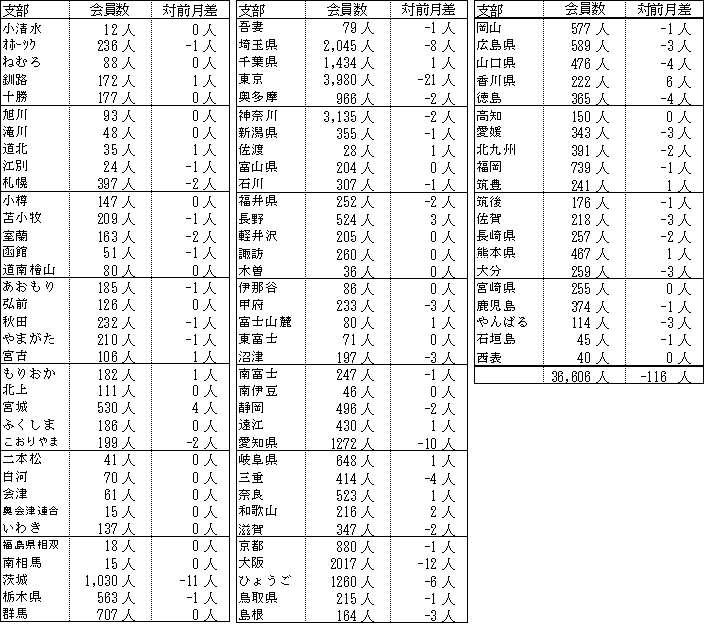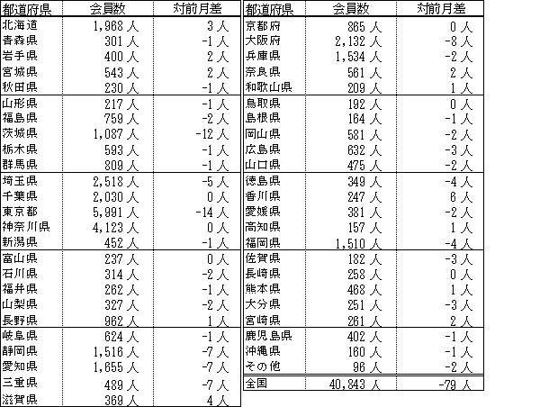 備考:支部別の会員数の合計は、都道府県別の会員数の合計と異なります。これは、本部型(青い鳥)会員や支部に所属されていない個人特別会員が支部別の会員数に含まれないためです。