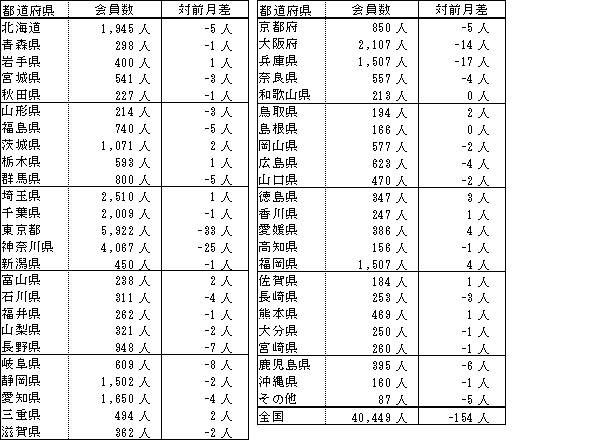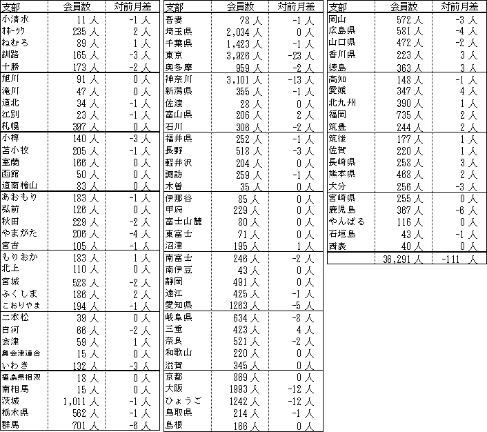 備考:支部別の会員数の合計は、都道府県別の会員数の合計と異なります。これは、本部型(青い鳥)会員や支部に所属されていない個人特別会員が支部別の会員数に含まれないためです。