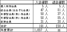 ※会費切れ退会となった後に会費が支払われ会員として復活する方がいらっしゃるため、退会者数の年度累計は、実際の退会者数とずれた数字となります。このため、退会者数合計については年度末の集計後にお知らせいたします。