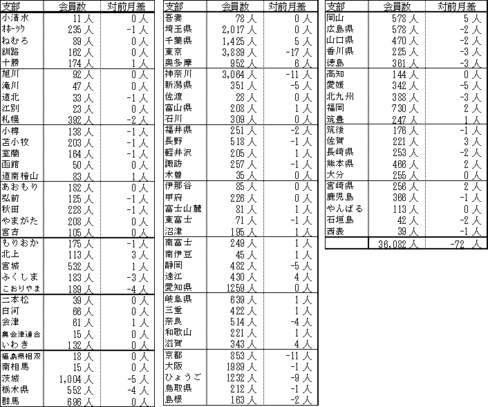 備考:支部別の会員数の合計は、都道府県別の会員数の合計と異なります。これは、本部型(青い鳥)会員や支部に所属されていない個人特別会員が支部別の会員数に含まれないためです。