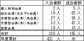※会費切れ退会となった後に会費が支払われ会員として復活する方がいらっしゃるため、退会者数の年度累計は、実際の退会者数とずれた数字となります。このため、退会者数合計については年度末の集計後にお知らせいたします。