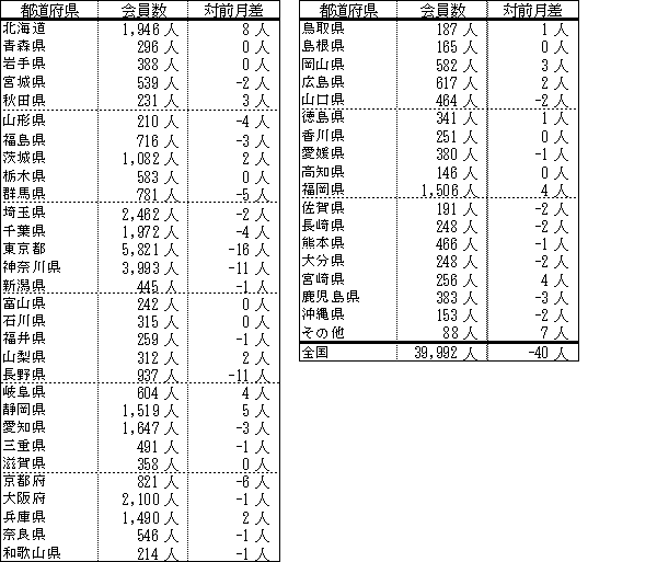 会員数は先月に比べ40人減少しました。