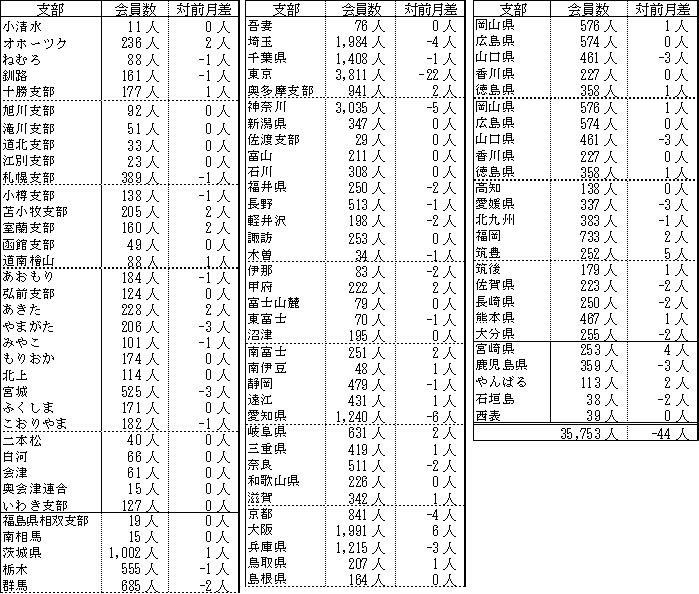 備考:支部別の会員数の合計は、都道府県別の会員数の合計と異なります。これは、本部型(青い鳥)会員や支部に所属されていない個人特別会員が支部別の会員数に含まれないためです。