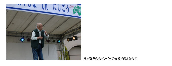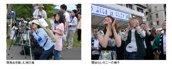 会長は、メインステージから来場者に対し、「今だからこそ、鳥の声に耳を傾けよう!」「自然の力を感じよう!」と探鳥会への参加を呼びかけ、福島県内と関東から日本野鳥の会のメンバーが応援にかけつけたことを伝えました。その呼びかけに応じて、総勢100名以上が集まり、大規模な探鳥会になりました。約1時間半のあいだでしたが、普段、地域の探鳥会で活躍されている支部の方々のわかりやすい説明や鳥にまつわる楽しいエピソードに、参加者は大満足。参加されたご家族からは、「震災以降、初めて屋外でゆっくり、楽しむことができました」との感想をいただきました。