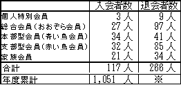 ※会費切れ退会となった後に会費が支払われ会員として復活する方がいらっしゃるため、退会者数の年度累計は、実際の退会者数とずれた数字となります。このため、退会者数合計については年度末の集計後にお知らせいたします。