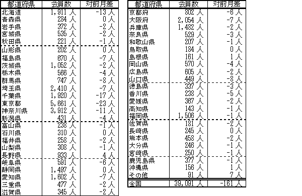 会員数は先月に比べ161人減少しました。