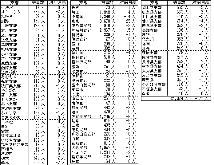 備考:支部別の会員数の合計は、都道府県別の会員数の合計と異なります。これは、本部型(青い鳥)会員や支部に所属されていない個人特別会員が支部別の会員数に含まれないためです。