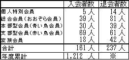 ※会費切れ退会となった後に会費が支払われ会員として復活する方がいらっしゃるため、退会者数の年度累計は、実際の退会者数とずれた数字となります。このため、退会者数合計については年度末の集計後にお知らせいたします。