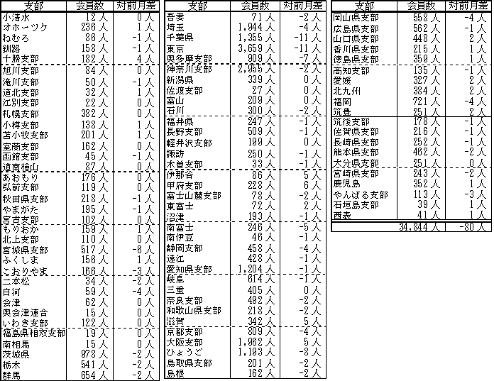 備考:支部別の会員数の合計は、都道府県別の会員数の合計と異なります。これは、本部型(青い鳥)会員や支部に所属されていない個人特別会員が支部別の会員数に含まれないためです。
