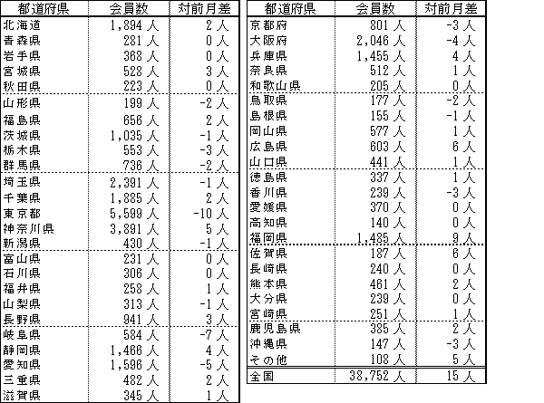 7月1日会員数38,752人(対前月+15)会員数は先月に比べ15人増加しました。