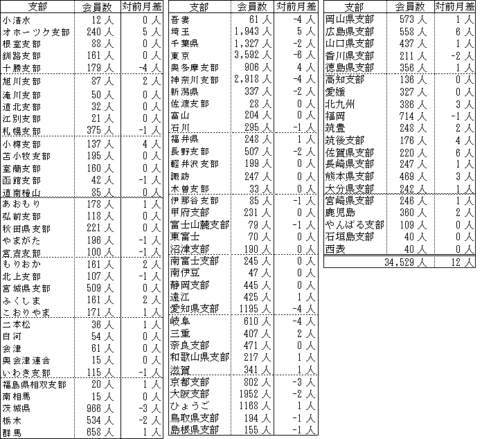 備考:支部別の会員数の合計は、都道府県別の会員数の合計と異なります。これは、本部型(青い鳥)会員や支部に所属されていない個人特別会員が支部別の会員数に含まれないためです。
