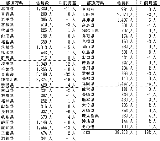 備考:支部別の会員数の合計は、都道府県別の会員数の合計と異なります。これは、本部型(青い鳥)会員や支部に所属されていない個人特別会員が支部別の会員数に含まれないためです。