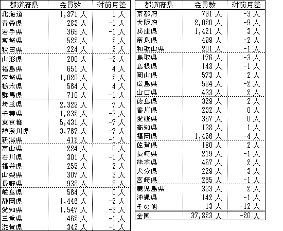 7月1日会員数37,823人(対前月-20)会員数は先月に比べ20人減少しました。