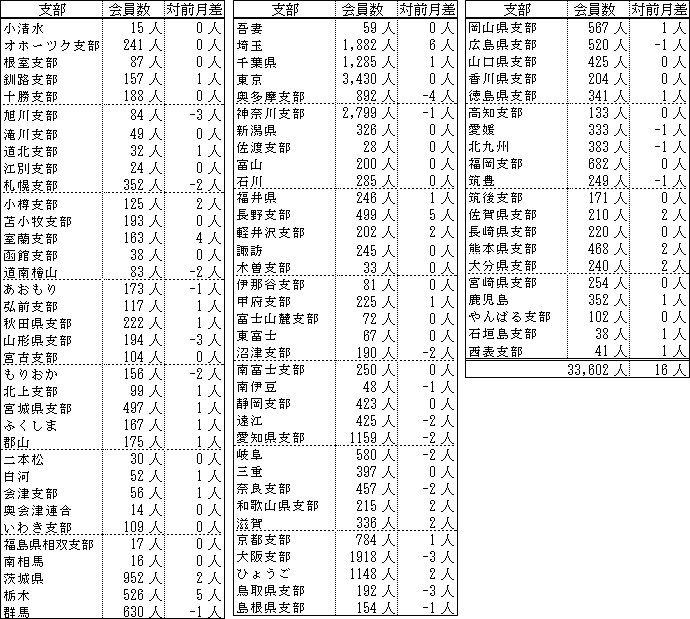 備考:支部別の会員数の合計は、都道府県別の会員数の合計と異なります。これは、本部型(青い鳥)会員や支部に所属されていない個人特別会員が支部別の会員数に含まれないためです。
