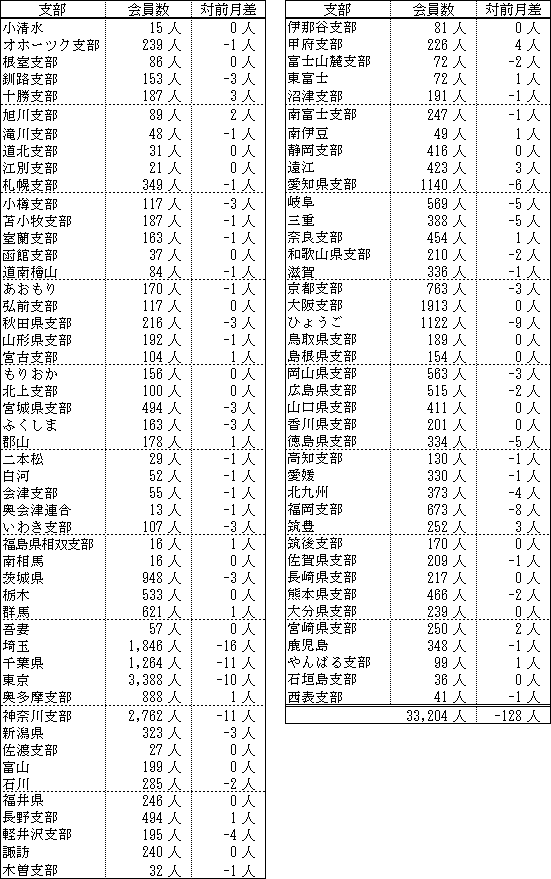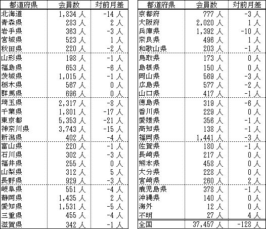 備考:支部別の会員数の合計は、都道府県別の会員数の合計と異なります。