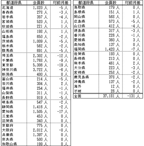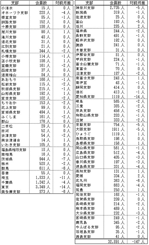備考:支部別の会員数の合計は、都道府県別の会員数の合計と異なります。